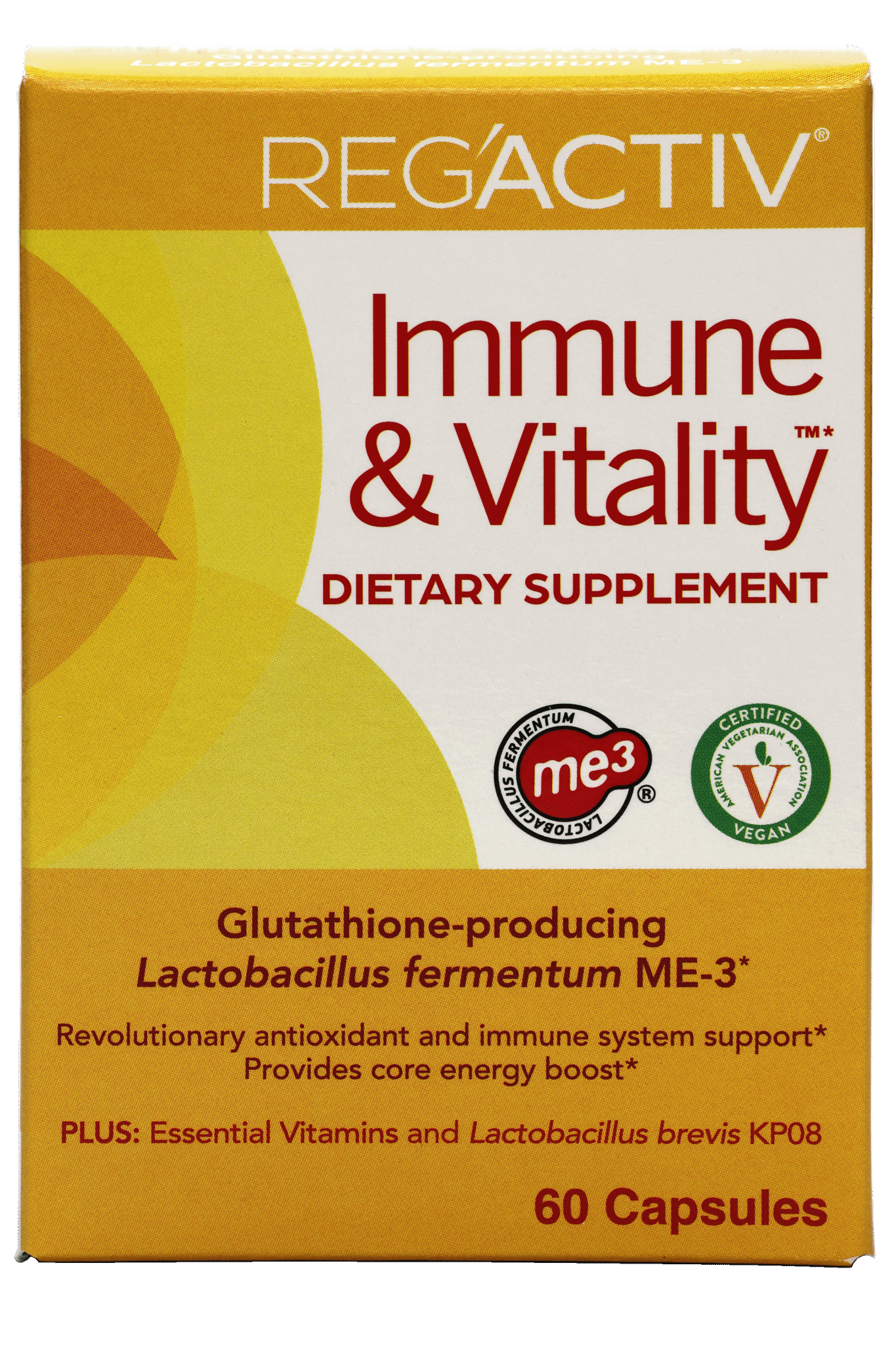 Reg´Activ® IMMUNE & VITALITY contains the revolutionary probiotic strain Lactobacillus fermentum ME-3. Studied for over 20 years, ME-3 produces glutathione—well known for its antioxidant, detoxification, and immune system-supporting activities.*