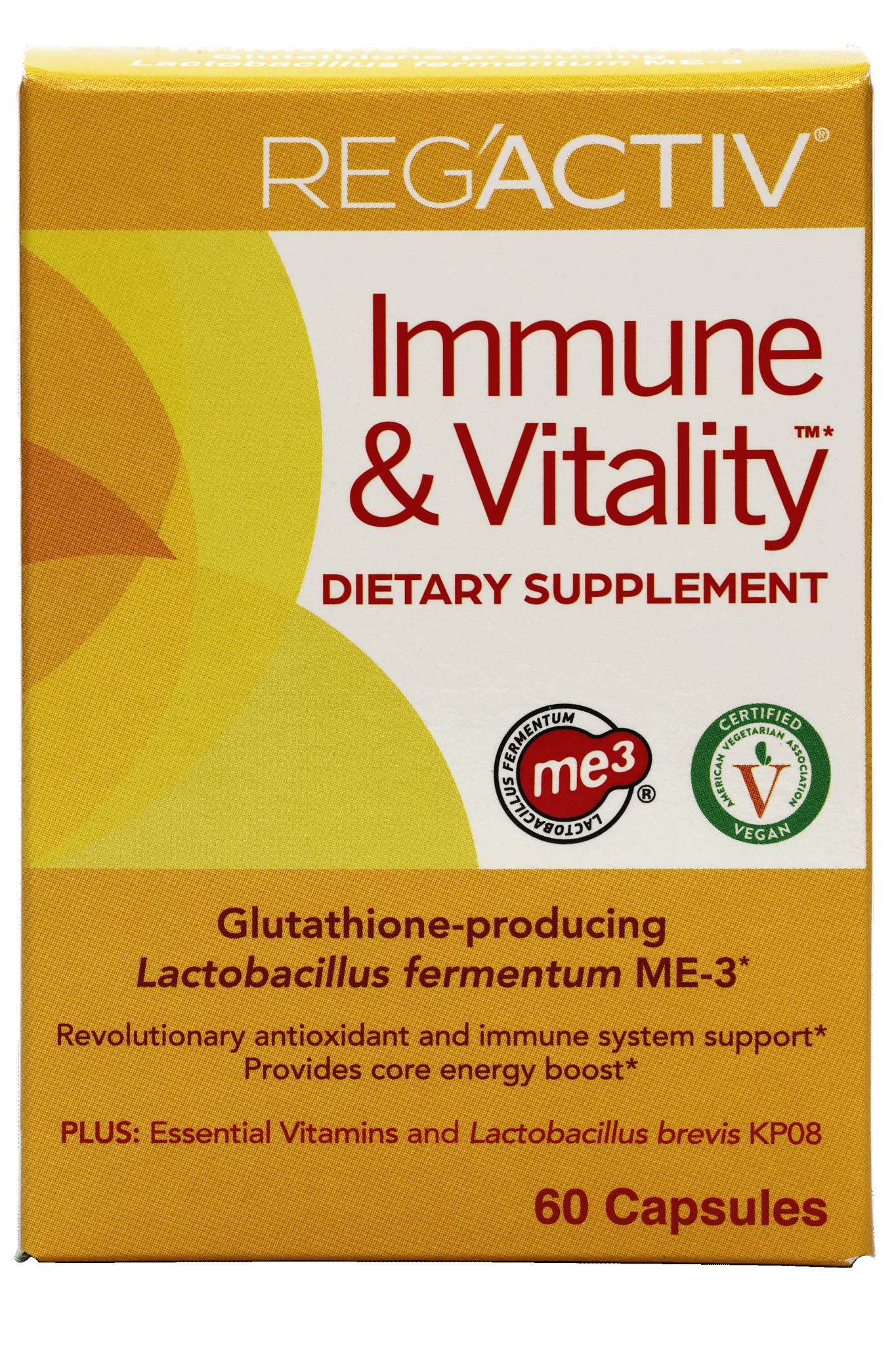 Reg´Activ® offers a novel approach to boosting glutathione levels. Its key ingredient, Lactobacillus fermentum ME-3, is a probiotic that works within the gut to maintain healthy glutathione levels. This supports: